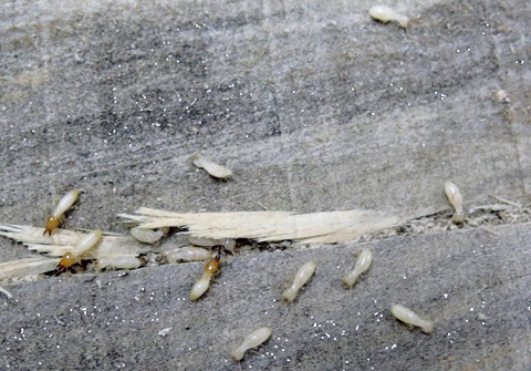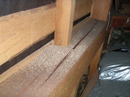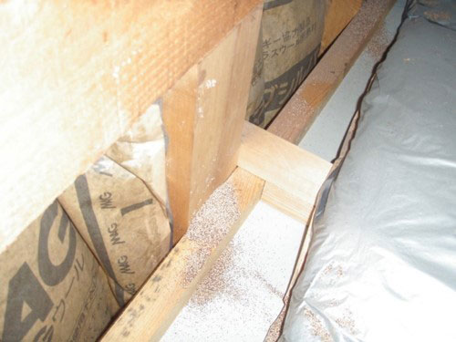 ここ数年の間に増加しているのがアメリカカンザイシロアリです。カンザイ(乾材)というだけあって乾いた木材を好み食害をしていきます。床下や水回りの湿った木材より小屋裏の乾いた材料を好んで食害する傾向があり、被害は小屋裏に集中します。ヤマトシロアリやイエシロアリのように木材表面に蟻道を構築しないので、生息範囲の特定が困難です。