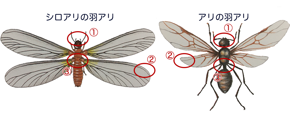 シロアリとクロアリは次の点で簡単に見分けられます。