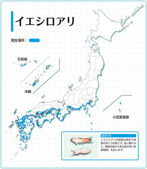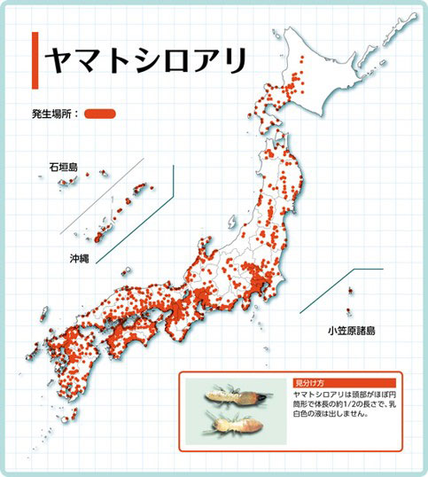 ヤマトシロアリは北海道北部を除く日本全土に、イエシロアリは神奈川県以西の海岸線に沿った温暖な地域と千葉県の一部、それに南西諸島、小笠原諸島に分布 しています。イエシロアリは千葉県以西の温暖な海岸線に沿った地域に散発的に発生しており、ダイコクシロアリは奄美大島以南に分布しています。