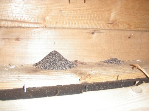 被害材の食害孔から乾いた砂粒状の糞を排出するのが特徴です。