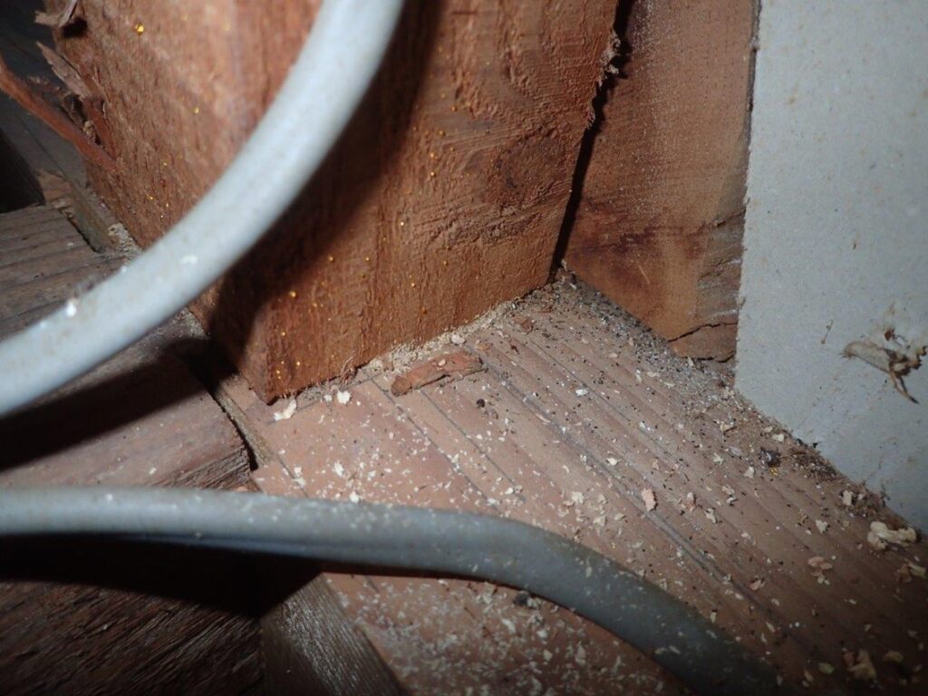 小屋束と梁の接合部に蟻土が詰まってました。そして蟻道が上っていた和室の畳をあげると