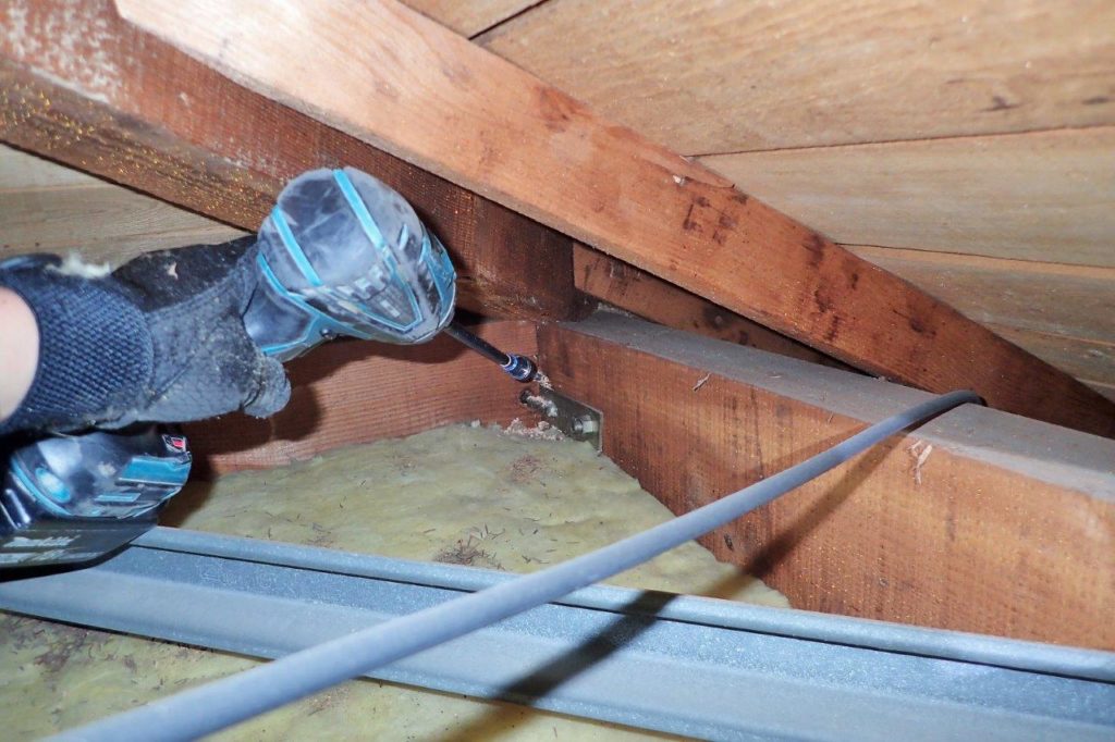 2階の小屋裏から施工開始です。養生終了後小屋裏に上ってみると、