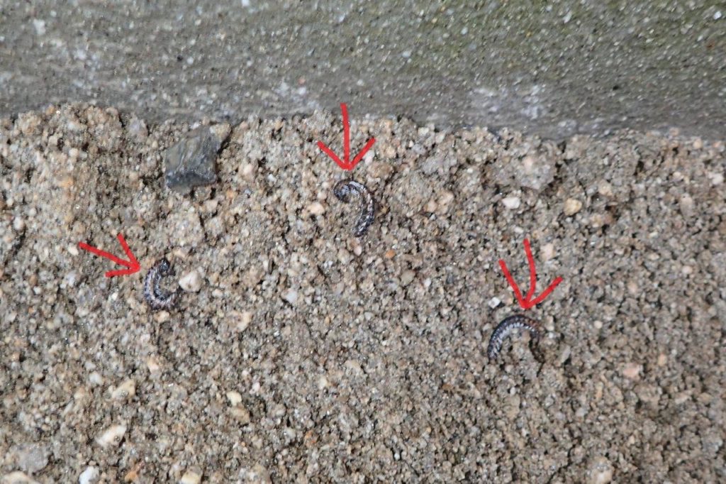燃やされて黒焦げになったヤスデの死骸が確認できました。