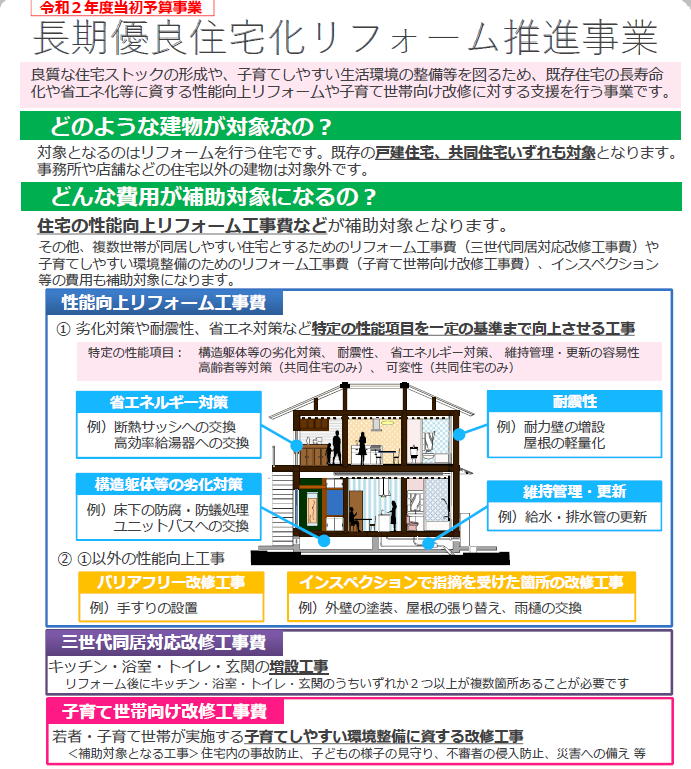 この制度は簡単に言うと住宅の質を向上させるリフォームを行うと工事費用の1/3が補助されるというものです。決められた条件を満たす必要がありますが優良な制度となっております。