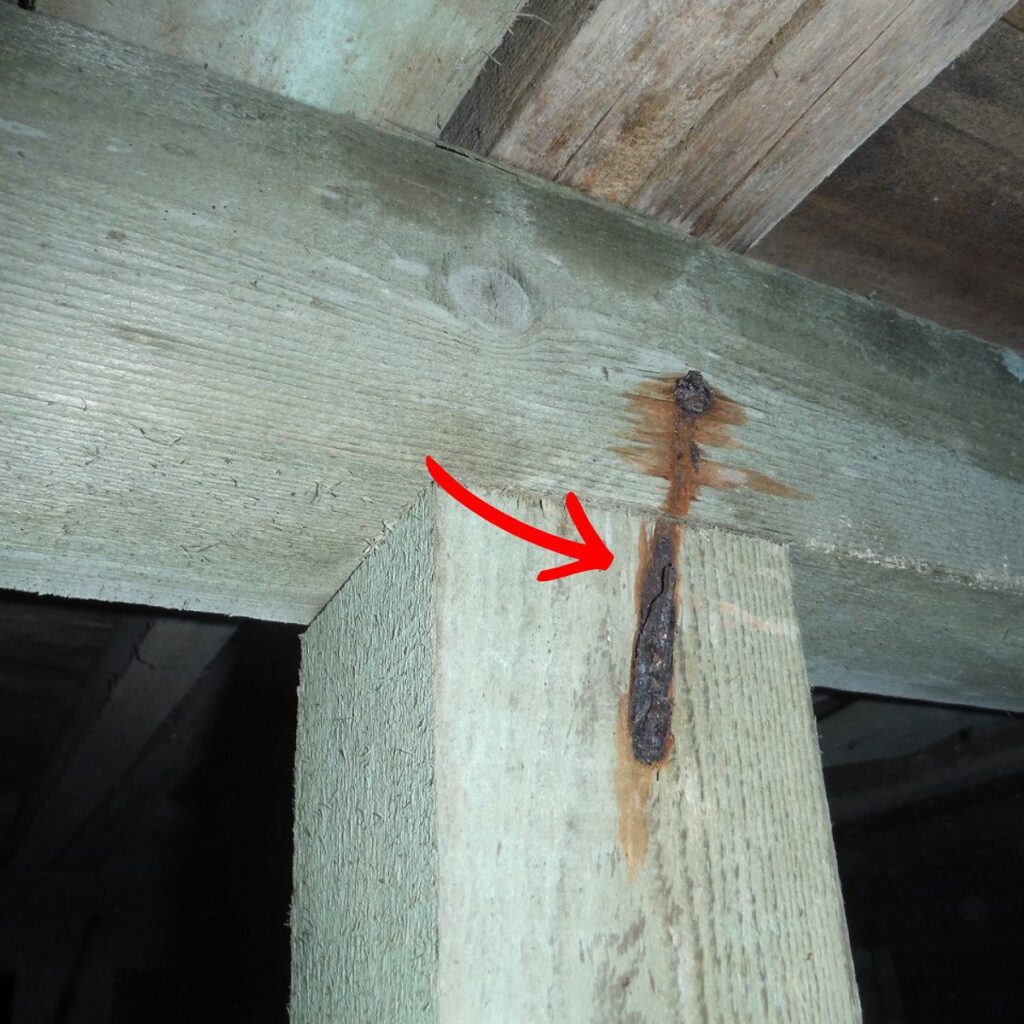 床下の鋼製束や金具、ジャッキにサビが出ている場合、長期間湿気がこもっているサインです。