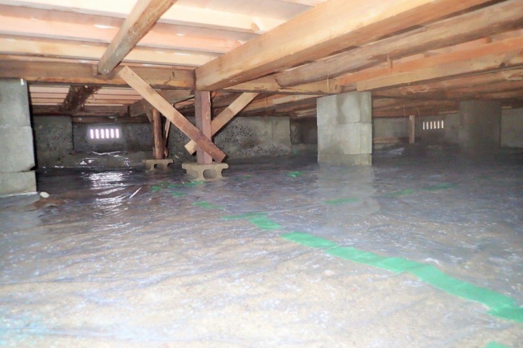 今回の調湿工事は床下全面に【①防湿フィルム敷設+②調湿剤敷設】という施工内容です。